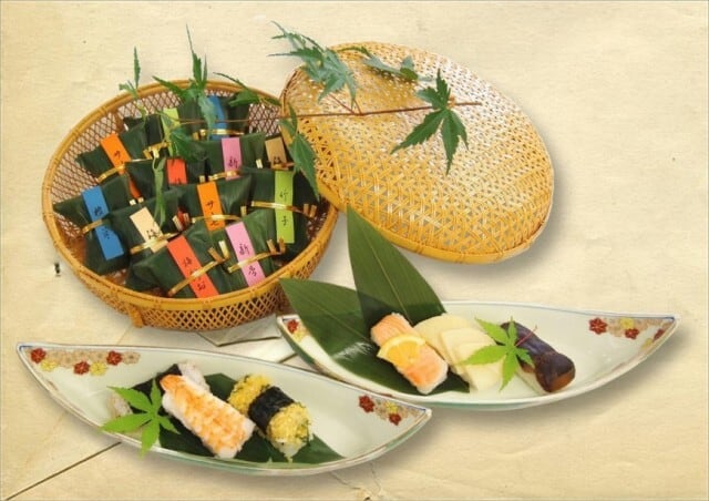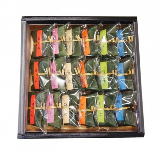 酢飯(白飯、米酢、砂糖、その他)、酢〆海老、酢〆サーモントラウト、竹の子煮、椎茸煮、梅かつお(梅肉、鰹節、のり、その他)、お新香(たくあん漬け、のり、シソ、胡麻、その他)